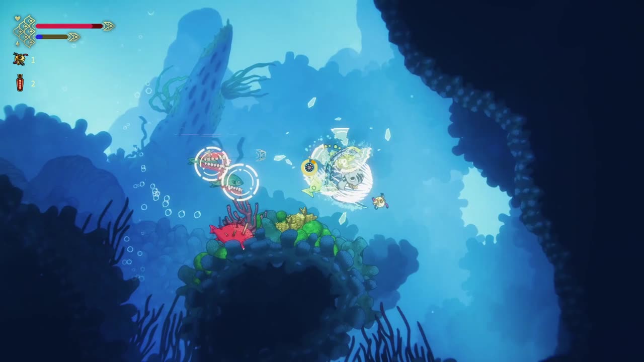Explore the fallen underwater city, Royla, in an underwater Metroidvania experience.
