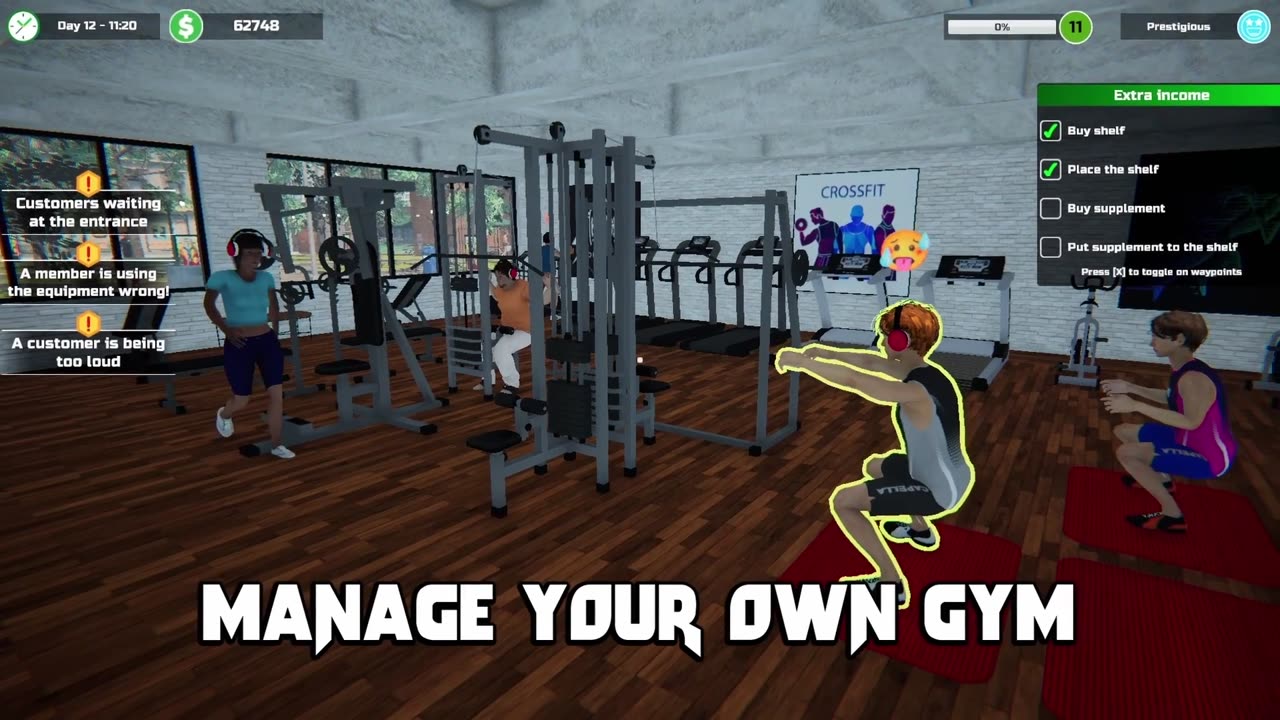 As the main mechanic of the game, you will have to manage, build, and expand your gym. You can buy new equipment, upgrade existing ones and sell supplements. You can also expand your gym by demolishing walls, buying new decorations, and opening facilities like a sauna, massage salon, solarium, and locker room. Meanwhile, you must protect your gym from potential danger, keep the gym clean and manage your members.