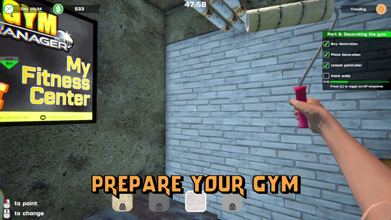 Build and manage your own gym: Design your gym to your liking by choosing the equipment, decoration, and facilities you want. Expand your gym by demolishing walls and opening new facilities like a sauna, massage salon, solarium, and locker room.