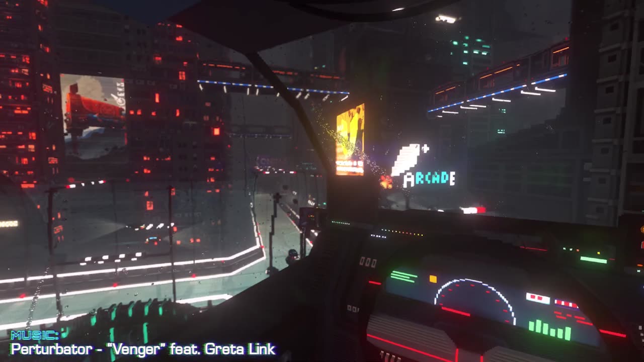 Explore an immense vertical cyberpunk city with your hover car and on foot