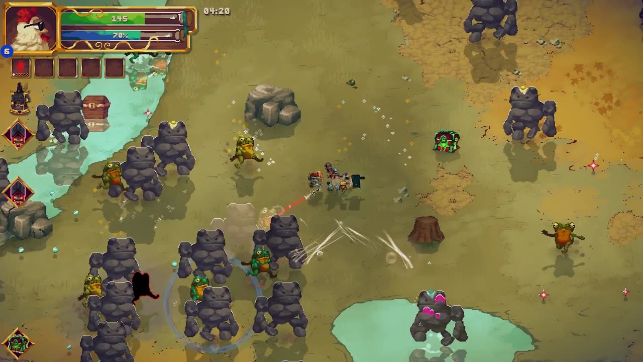 Игроки будут сталкиваться с невероятно сложными боссами и гигантскими монстрами, которые стоят на пути к полному разрушению коррумпированной реальности лягушек. Каждое сражение подталкивает игроков к использованию всех своих возможностей, но ничем не устрашающая мощь вашей магической курицы позволяет ей уверенно искоренять любых противников на поле битвы.