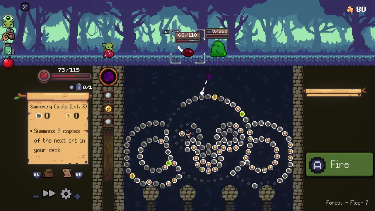 Бой с врагами происходит по принципу Pachinko: ваше мастерство и расчеты позволят использовать силу гравитации для стратегического уничтожения врагов. Вы можете применять критические зелья, зелья восстановления и бомбы, чтобы помочь себе в бою или нанести дополнительный урон противникам.