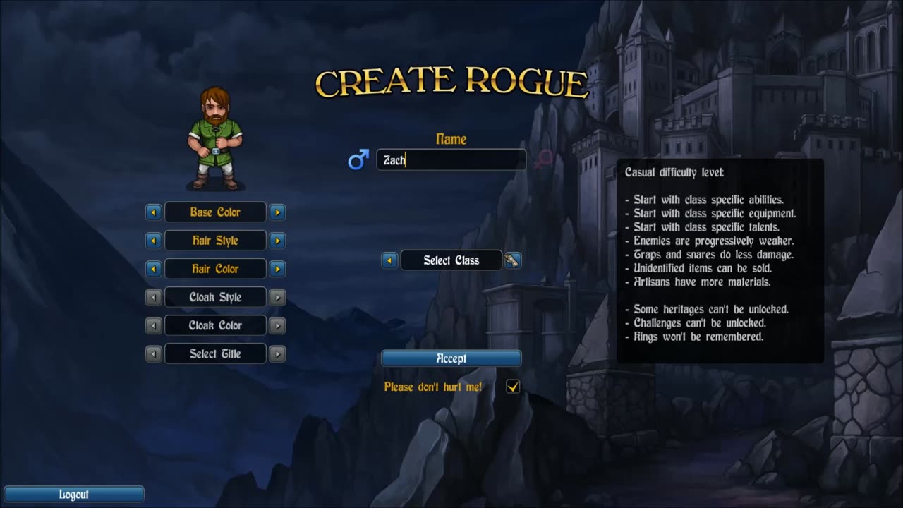 Игра известна своей суровой механикой: смерти в Rogue's Tale кажутся несправедливыми и внезапными, причем они являются постоянными. Однако это побуждает игроков изучать механизмы игры, чтобы минимизировать потерю прогресса. Системы учителей и опыта позволяют персонажу развиваться через 27 талантов и 60 заклинаний.
