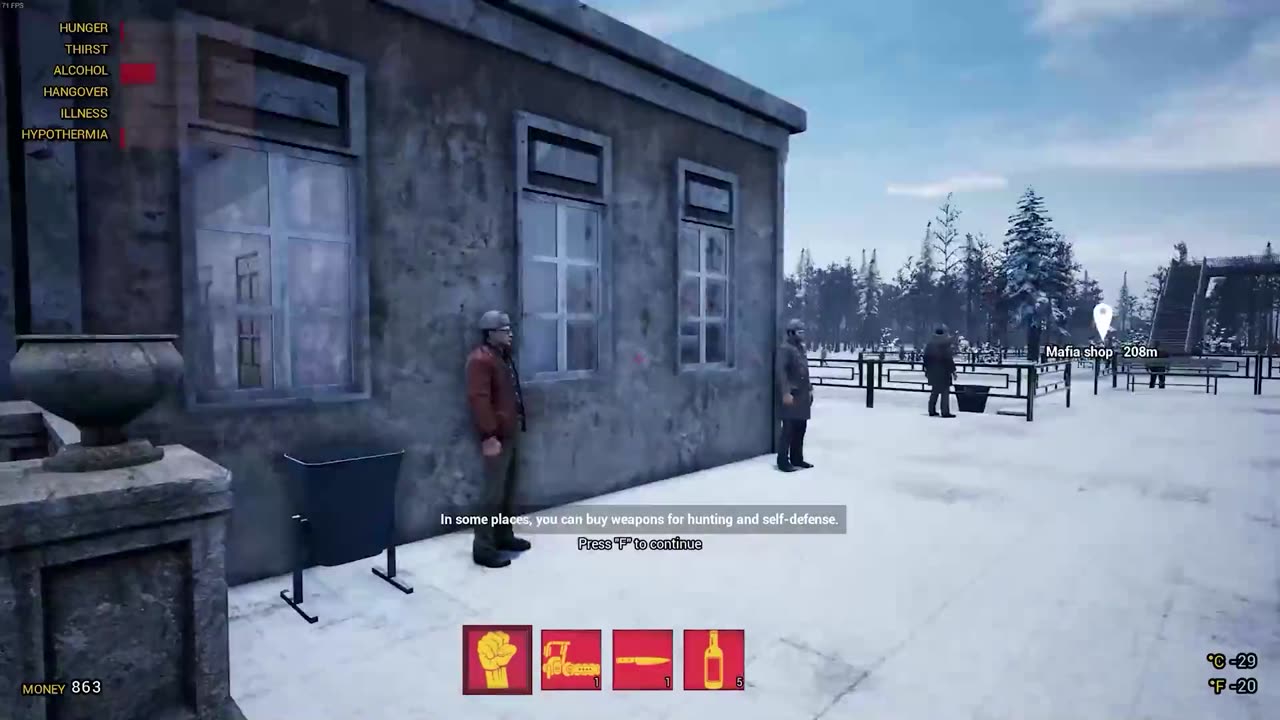 - Система выживания: управляйте уровнями голода, жажды, заболеваний, переохлаждения, алкоголя и похмелья для сохранения жизни.