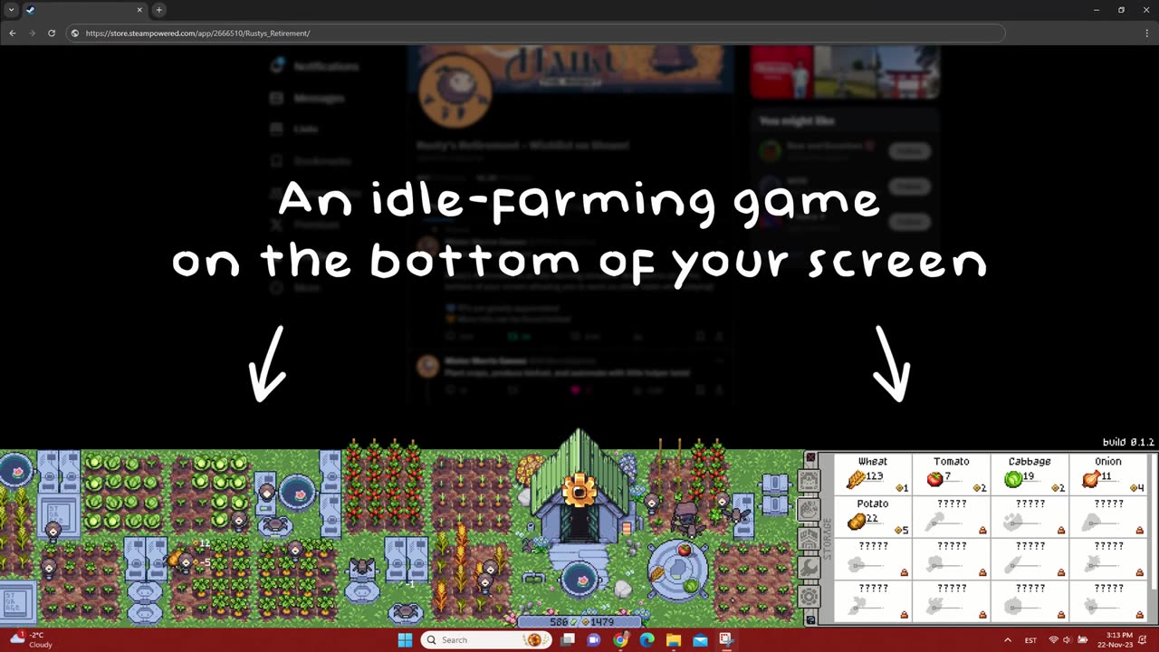 Rusty's Retirement создан для комфортного размещения в нижней части экрана, позволяя выполнять другие задачи, пока вы занимаетесь фермерством. Вы можете увеличить или уменьшить масштаб для менее отвлекающего просмотра или активировать режим «Фокус», который замедляет производство культур.