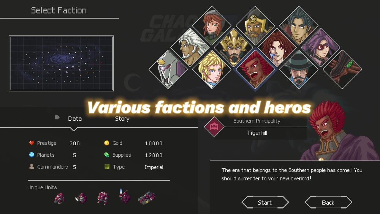 Chaos Galaxy 2 — это стратегическая игра в стиле ретро, вдохновлённая такими известными проектами, как «Роман о трёх царствах», «Advance War» и «Super Robot Wars». Разработчик создал программу, искусство и дизайн самостоятельно. Игрокам предлагается управлять своими планетами и строить различные зоны: фермы, роя, лаборатории, орбитальные верфи, заводы по производству кораблей и военные крепости. Основная цель — создавать сотни различных кораблей и меха, назначать командиров для их руководства, побеждать вражеские флоты и захватывать планеты противников.