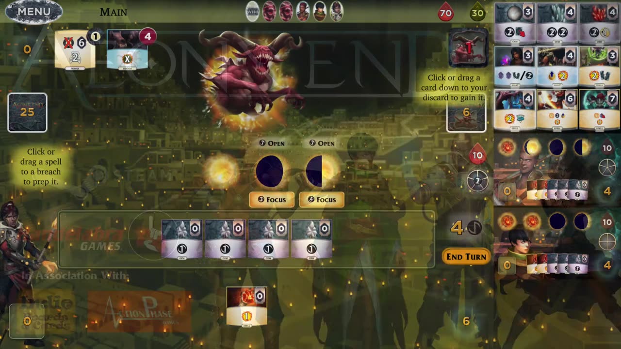 «Aeon's End» — это уникальная колодостроительная настольная игра, в которой игроки создают команду из до 4 магов для совместной борьбы с Немесисом, пришедшим через разрыв времени. Игра начинается с базовой колодой из 10 карт: 5 в руке. Каждый ход вы получаете аэрус, который используется для покупки новых камней и артефактов, обучения новым заклинаниям и увеличения способности кастовать, открывая дополнительные разрывы. Артефакты позволяют дать себе или союзникам бонус на следующих ходах.