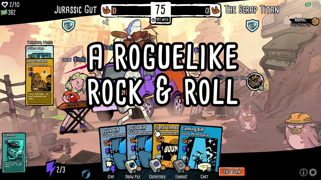 "Battle Bands: Rock & Roll Deckbuilder" — это уникальная карточная игра в жанре рогалка, где вы становитесь участником музыкальной битвы за звание легенды рока. Вы начинаете как герой гаражной группы и продвигаетесь к вершине, став монстром-маэстро с гитарой. Ваш успех в карточных баталиях зависит от умения строить колоду: вы можете выбрать инструмент (гитара, бас, клавиши или барабаны) и собрать уникальную колоду из сотен карт, включая специальные карты Reign.